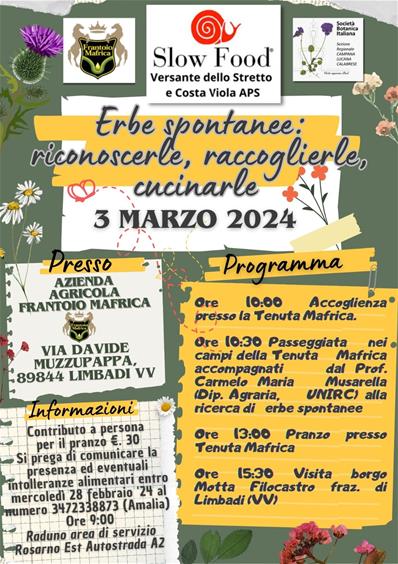 La Sezione Regionale Campana-Lucana-Calabrese ha organizzato per il prossimo 3 marzo 2024 un'attività didattica dal titolo "Erbe spontanee: riconoscerle, raccoglierle, cucinarle", in collaborazione con Slow Food - Versante dello Stretto e Costa Viola APS e l'Azienda Agricola Frantoio Mafrica. L'attività è finalizzata all’osservazione delle specie vegetali vascolari, al loro riconoscimento in campo, nonchè all'analisi dei possibili usi in gastronomici. Ulteriori informazioni sono riportate nella locandina allegata (Erbe spontanee.jpeg).